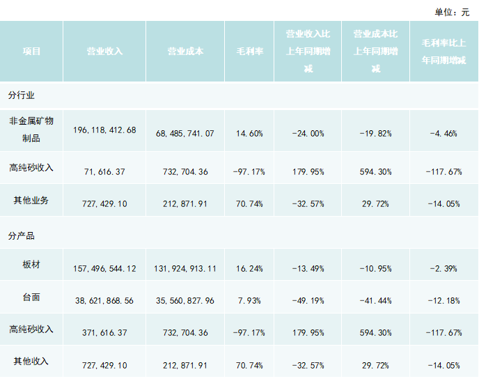 2025年上半年,中旗新材營收1.97億元(同比降23.93%),凈利252.3萬元(同比降89.35%);核心產品中,人造石英石板材營收1.57億元(降13.49%,毛利率16.24%)、臺面0.39億元(降49.19%,毛利率7.93%),高純石英砂營收37.2萬元(增179.95%,毛利率-97.17%)。