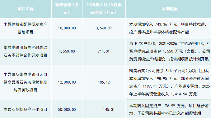 在建項目推進順利,半導體精密配件研發(fā)生產基地等4大項目總預算7.655億元,凱美石英石英砂項目實現(xiàn)營收1414.54萬元。