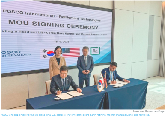 ReElement Technologies與韓國浦項制鐵國際公司簽署諒解備忘錄,計劃在美國建設(shè)首個完全垂直整合的稀土及永磁體生產(chǎn)綜合體。