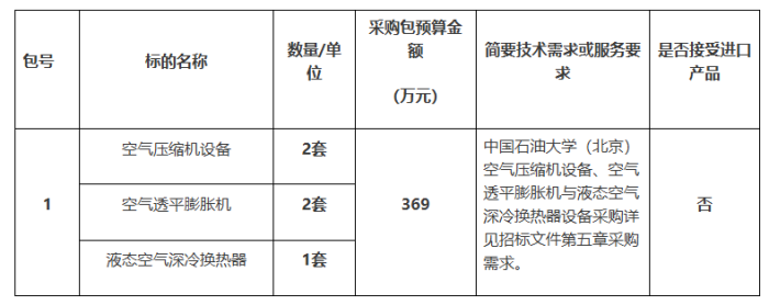 項目名稱:中國石油大學(北京)空氣壓縮機設(shè)備、空氣透平膨脹機與液態(tài)空氣深冷換熱器設(shè)備采購