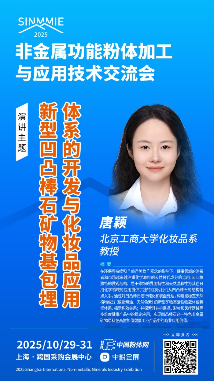 有業(yè)內(nèi)人士指出,在化妝品領(lǐng)域,凹凸棒石正在從傳統(tǒng)的吸附劑、增稠劑,向高性能防曬載體、活性物緩釋平臺和智能護膚系統(tǒng)等高附加值方向轉(zhuǎn)變,發(fā)展?jié)摿Σ粩噌尫拧?/span>10月29-31日,北京粉體技術(shù)協(xié)會、柏德英思展覽(上海)有限公司、山東中粉會展服務(wù)有限公司將在上?鐕少彆怪行穆(lián)合主辦“上海國際非金屬礦工業(yè)展覽會(SINMMIE2025)”,展會現(xiàn)場將同期舉辦“非金屬功能粉體加工與應(yīng)用技術(shù)交流會”,屆時將邀請北京工商大學(xué)唐穎教授作《新型凹凸棒石礦物基包埋體系的開發(fā)與化妝品應(yīng)用》專題報告,分享凹凸棒石純化和表面處理技術(shù),新型礦物基活性物載體或包埋體系構(gòu)建和應(yīng)用技術(shù),并探索其在護膚品、彩妝和醫(yī)療器械等多維度健康產(chǎn)品中的穩(wěn)定應(yīng)用等內(nèi)容。