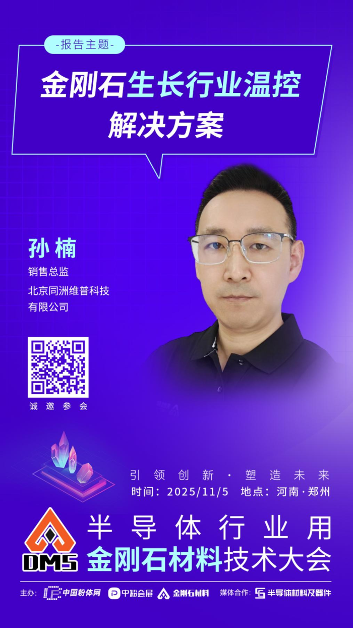 2025年11月5日,中國粉體網(wǎng)將在河南•鄭州舉辦“2025半導體行業(yè)用金剛石材料技術大會”。屆時,來自北京同洲維普科技有限公司銷售總監(jiān)孫楠將帶來《金剛石生長行業(yè)溫控解決方案》的報告。