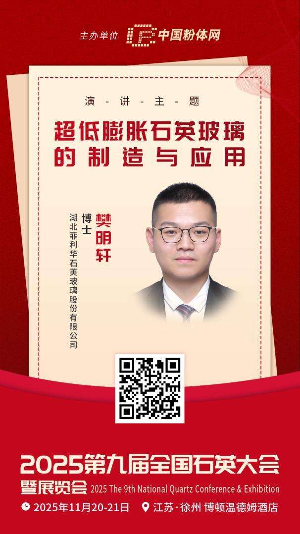 2025年11月20-21日,由中國粉體網(wǎng)主辦的“2025第九屆全國石英大會(huì)暨展覽會(huì)”將在江蘇徐州召開,湖北菲利華石英玻璃股份有限公司樊明軒博士將做《超低膨脹石英玻璃的制造與應(yīng)用》的報(bào)告,屆時(shí),他將詳細(xì)解讀超低膨脹石英玻璃的制造與應(yīng)用等關(guān)鍵問題,為行業(yè)同仁提供極具價(jià)值的參考與借鑒。