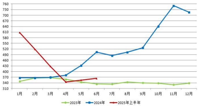 2025年上半年海外氧化鋁價(jià)格整體呈現(xiàn)下跌態(tài)勢(shì)。年初以來(lái),海外氧化鋁新產(chǎn)能陸續(xù)投產(chǎn)并釋放產(chǎn)量,供應(yīng)端持續(xù)改善,對(duì)海外氧化鋁價(jià)格形成壓制,疊加國(guó)內(nèi)氧化鋁價(jià)格存在階段性出口優(yōu)勢(shì),多種因素共同導(dǎo)致海外氧化鋁市場(chǎng)呈現(xiàn)供強(qiáng)需弱局面,推動(dòng)海外氧化鋁市場(chǎng)價(jià)格自高點(diǎn)斷崖性回落。2025年上半年海外氧化鋁市場(chǎng)均價(jià)為436美元/噸左右,較去年同期上漲約8%。