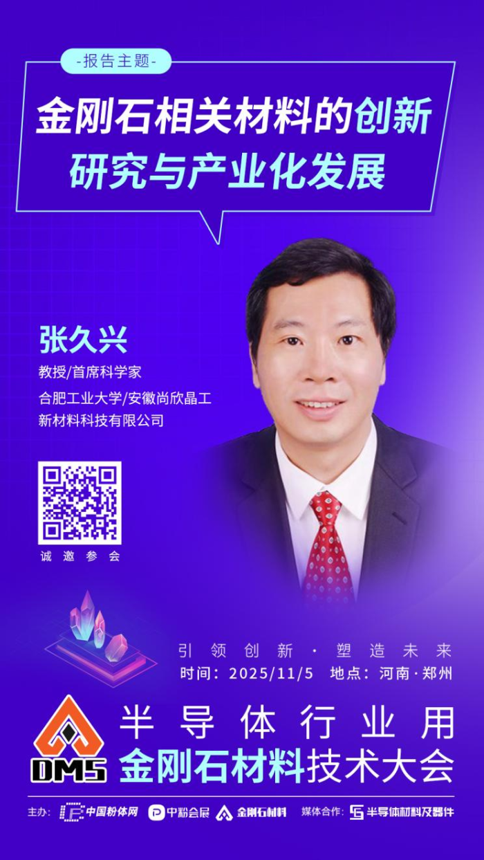 2025年11月5日,中國粉體網(wǎng)將在河南•鄭州舉辦“2025半導(dǎo)體行業(yè)用金剛石材料技術(shù)大會”。屆時(shí),我們邀請到合肥工業(yè)大學(xué)張久興教授出席本次大會并作題為《金剛石相關(guān)材料的創(chuàng)新研究與產(chǎn)業(yè)化發(fā)展》的報(bào)告,報(bào)告將闡述SPS獨(dú)特?zé)Y(jié)機(jī)理和效應(yīng),分析SPS技術(shù)在高新材料研究中的優(yōu)勢和產(chǎn)業(yè)化可行性,系統(tǒng)介紹金剛石二級增壓用特種硬質(zhì)合金、金剛石-金屬復(fù)合材料的研究進(jìn)展與未來展望。