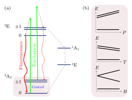 金剛石氮空位中心自旋量子傳感工作原理:(a)自旋能級(jí)結(jié)構(gòu)和光學(xué)躍遷;(b)外場(chǎng)對(duì)金剛石氮空位中心基態(tài)能級(jí)的影響(從上至下:壓強(qiáng)、溫度、磁場(chǎng))
