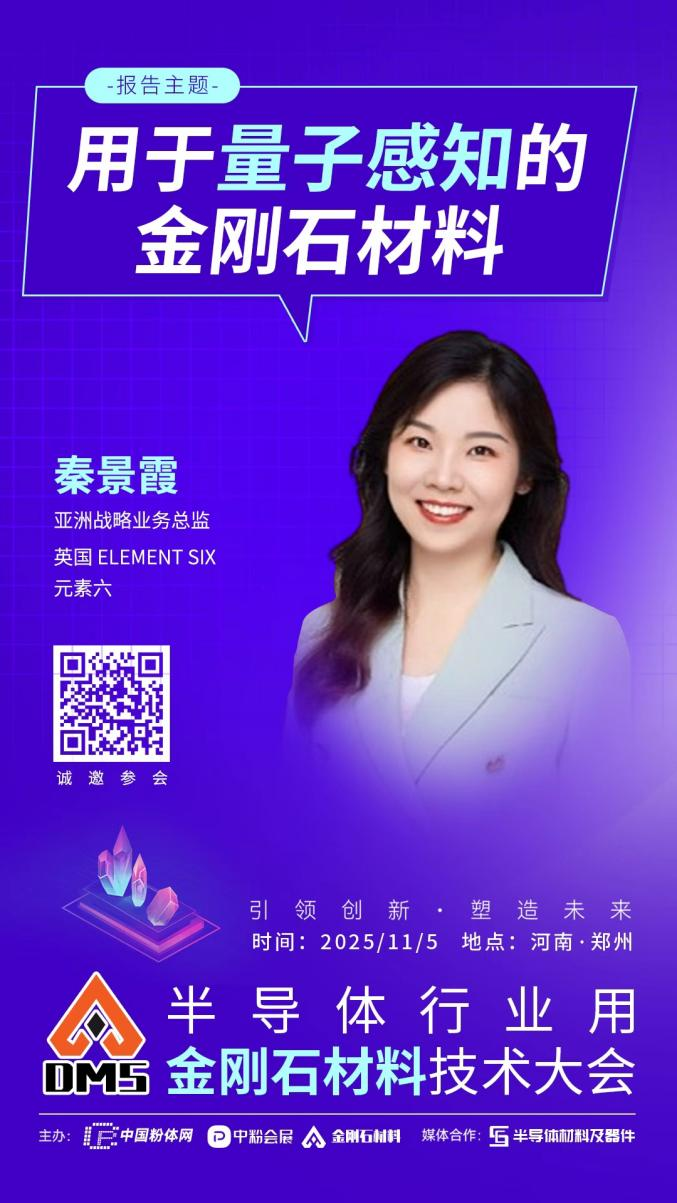 2025年11月5日,中國(guó)粉體網(wǎng)將在河南•鄭州舉辦“2025半導(dǎo)體行業(yè)用金剛石材料技術(shù)大會(huì)”。屆時(shí),我們邀請(qǐng)到Element Six(元素六)亞洲戰(zhàn)略業(yè)務(wù)總監(jiān)秦景霞出席本次大會(huì)并作題為《用于量子感知的金剛石材料》的報(bào)告,將聚焦量子金剛石材料,系統(tǒng)闡述量子金剛石的制備與應(yīng)用:包括通過(guò)MPCVD技術(shù)精準(zhǔn)調(diào)控N含量至ppm級(jí)別,展示量子金剛石在不同領(lǐng)域的獨(dú)特優(yōu)勢(shì),淺層NV中心采用電子級(jí)單晶基底直接生長(zhǎng)工藝等。