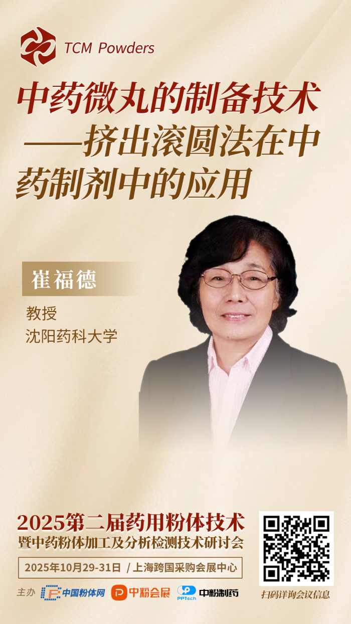 聚焦“從粉體技術(shù)、論中藥工藝”為主題,10月29-31日,中國粉體網(wǎng)將于2025IPIE上海高端粉體裝備與科學(xué)儀器展覽會期間,同期舉辦“2025第二屆藥用粉體技術(shù)暨中藥粉體加工及分析檢測技術(shù)研討會”,屆時來自沈陽藥科大學(xué)崔福德教授將為大家?guī)怼?span style="color: rgb(255, 0, 0);">中藥微丸的制備技術(shù)-擠出滾圓法在中藥制劑中的應(yīng)用》的主題報告。報告主講人將介紹擠出滾圓技術(shù)引入中藥微丸制備,已獲含提取物50~70%微丸、全草粉100%微丸及緩釋包衣制劑;中藥微丸成品體積、吸潮性與服藥負(fù)擔(dān)均顯著降低,并易實(shí)現(xiàn)緩釋。
