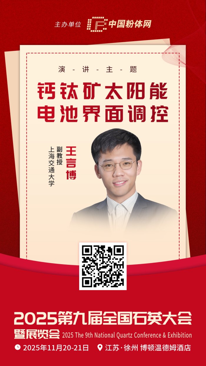 2025年11月20-21日,中國粉體網(wǎng)將在江蘇徐州舉辦“2025(第九屆)全國石英大會(huì)暨展覽會(huì)”。屆時(shí),上海交通大學(xué)副教授王言博將帶來題為《鈣鈦礦太陽能電池界面調(diào)控》的報(bào)告,為相關(guān)領(lǐng)域研究提供交流與參考。