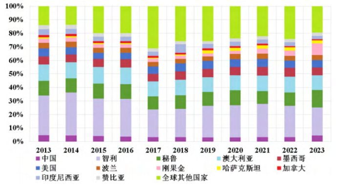 全球主要國家近10年來(2013—2023年)銅儲(chǔ)量占比圖