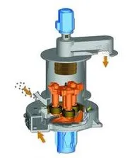 原料通過氣力輸料管道被輸送至研磨區(qū)。大部分氣流從磨盤下方的主風道入口進入研磨機,磨盤以70至120m/s線速度進行旋轉。通過分級輪的速度來進行調節(jié)產品的研磨細度。符合粒徑要求的產品通過分級機被分離出去,更大物料顆粒會被彈回并重新研磨。細粉在位于研磨機后方的旋風分離器/除塵器中從空氣中被過濾收集。
