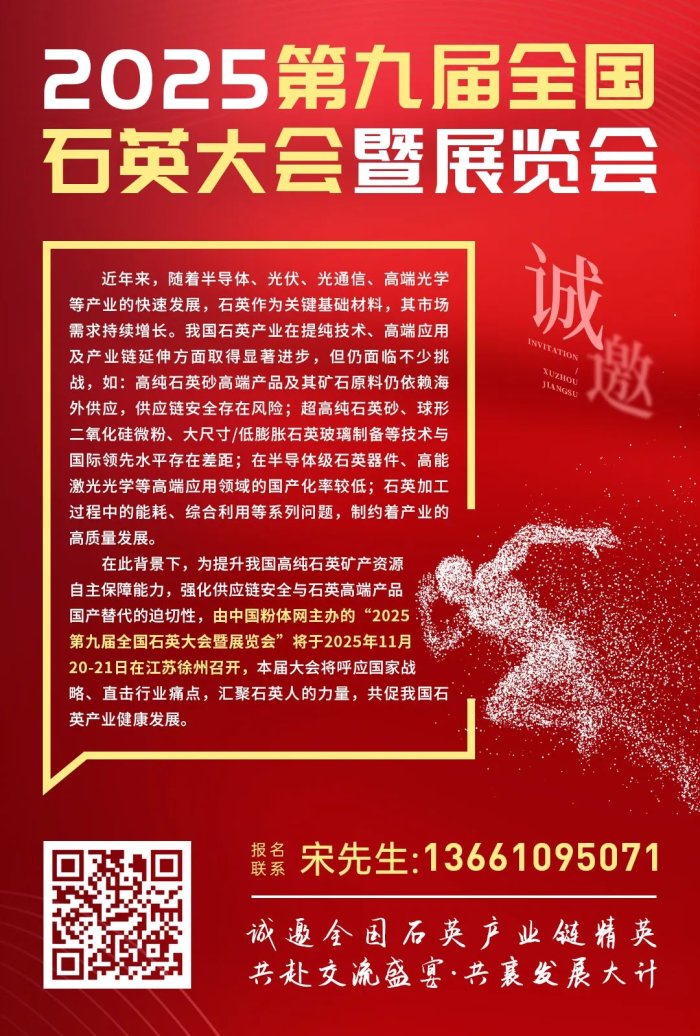 中國粉體網(wǎng)于將于2025年11月20-21號(hào)在江蘇省徐州市舉辦“ 2025(第九屆)全國石英大會(huì)暨展覽會(huì) ”,大連泰一明光電科技有限公司邀您一同參加。