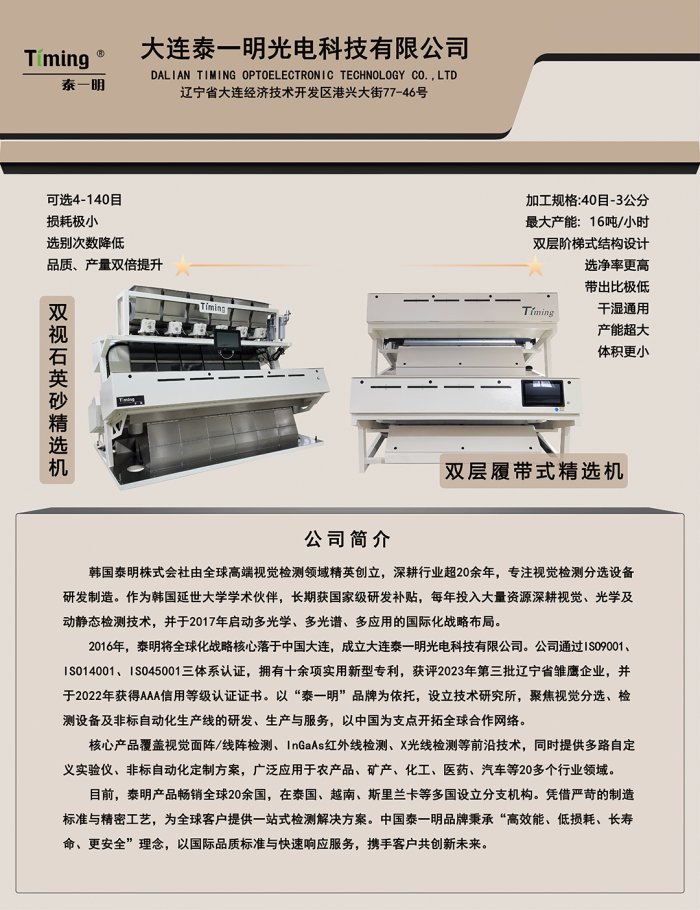 韓國泰明株式會(huì)社是由韓國色選機(jī)專業(yè)領(lǐng)域的一批精英所組建。它始終堅(jiān)持以質(zhì)量求生存,以信譽(yù)求發(fā)展,不斷研發(fā)設(shè)計(jì)和生產(chǎn)新產(chǎn)品,始終走在世界色選機(jī)行業(yè)的前例。我公司的產(chǎn)品遍及世界20多個(gè)國家,并在泰國、越南、斯里蘭卡、印度、秘魯設(shè)立了分支機(jī)構(gòu)。我公司的研發(fā)者具有二十年色選機(jī)研發(fā)制造經(jīng)驗(yàn),現(xiàn)已成功開拓大米、瓜子、雜糧、脫水蔬菜、茶葉等領(lǐng)域。并專門針對(duì)石英砂,鹽等特殊物料研制出防腐色選機(jī)。該機(jī)器可選別20-100目區(qū)間顆粒的產(chǎn)品。