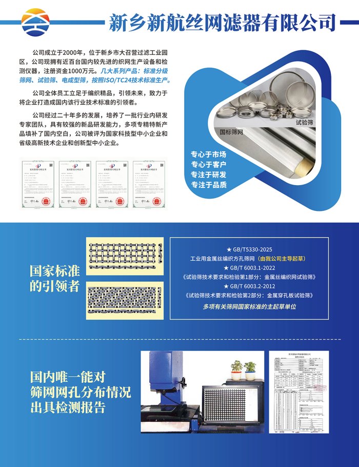 新鄉(xiāng)新航絲網(wǎng)濾器有限公司成立于2000年11月22日,位于河南省新鄉(xiāng)市新鄉(xiāng)縣大召營鎮(zhèn)過濾工業(yè)園區(qū)中路南2號。公司自成立以來,積極進行篩網(wǎng)編織技術(shù)的研發(fā),提高生產(chǎn)水平,幫助客戶解決生產(chǎn)使用中的相關(guān)問題,并參與制定試驗篩、篩網(wǎng)國際標準。