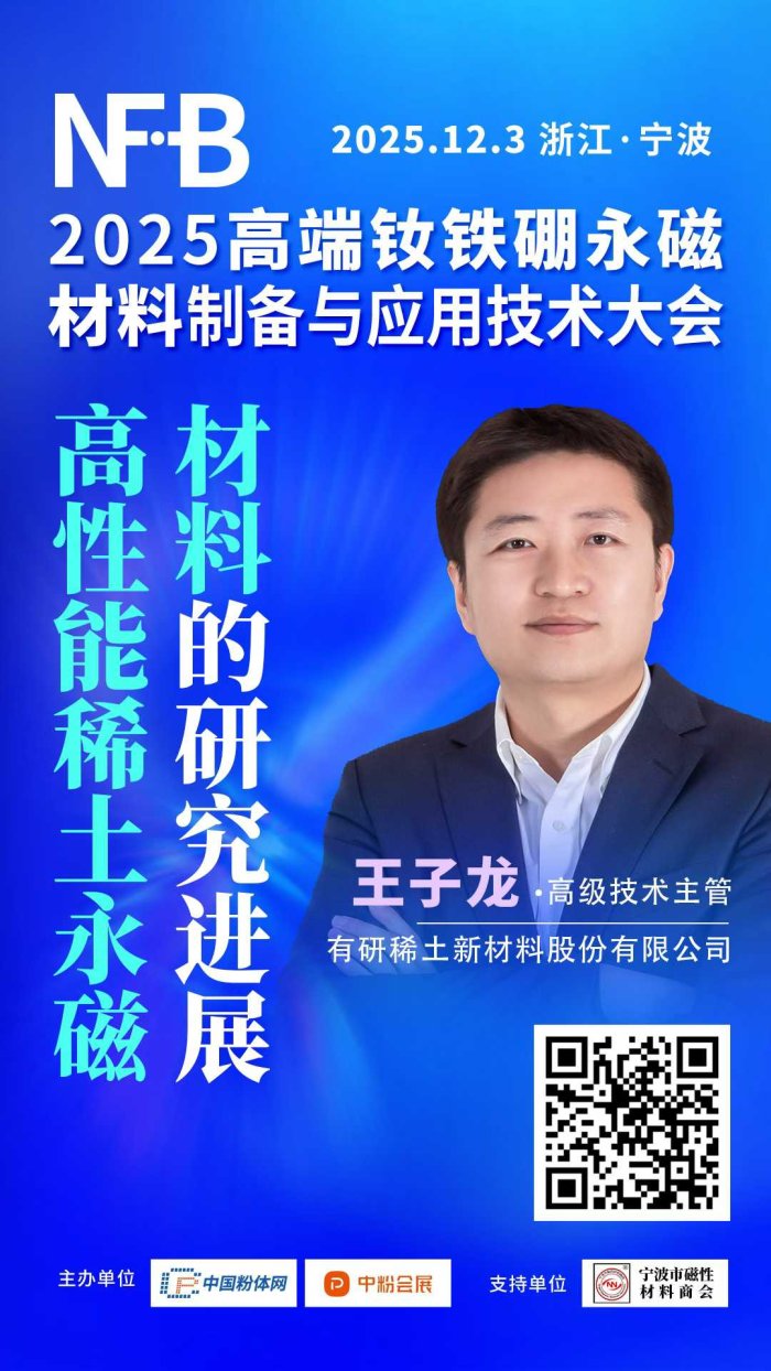 2025年12月3日,中國粉體網(wǎng)將在浙江·寧波舉辦“2025高端釹鐵硼永磁材料制備與應(yīng)用技術(shù)大會”。屆時,我們邀請到有研稀土新材料股份有限公司正高級工程師/高級技術(shù)主管王子龍出席本次大會并作題為《高性能稀土永磁材料的研究進展》的報告,王子龍工程師將為您介紹有研稀土在高性能燒結(jié)釹鐵硼、異方性粘結(jié)磁體等稀土永磁材料的研究進展。