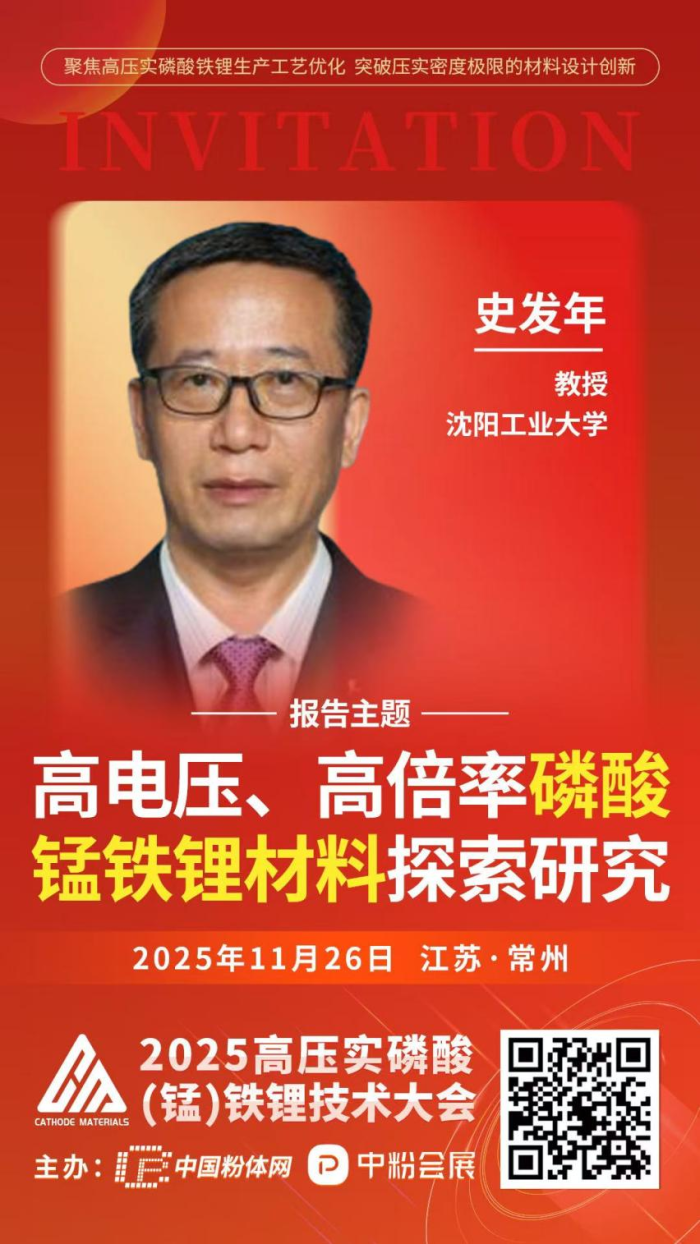 2025年11月26日,中國(guó)粉體網(wǎng)將在江蘇常州舉辦“2025高壓實(shí)磷酸(錳)鐵鋰技術(shù)大會(huì)”。屆時(shí),來自沈陽(yáng)工業(yè)大學(xué)的史發(fā)年教授將作《高電壓、高倍率磷酸錳鐵鋰材料探索研究》的報(bào)告。