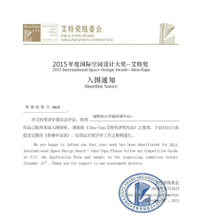 國際空間設(shè)計大獎——Idopsea-T艾特獎,由中國建筑室內(nèi)設(shè)計行業(yè)第一門戶網(wǎng)站——中華室內(nèi)設(shè)計網(wǎng)聯(lián)合中國三大權(quán)威學(xué)術(shù)機構(gòu)——清華大學(xué)美術(shù)學(xué)院、中央美術(shù)學(xué)院、天津美術(shù)學(xué)院共同發(fā)起主辦,每年一屆,12月隆重頒獎,旨在打造全球最具思想性和影響力的設(shè)計大獎,發(fā)掘和表彰最佳設(shè)計師和最佳設(shè)計作品。深圳集合設(shè)計作品深圳南山書城培訓(xùn)中心得到大賽評委們的一致的認可,獲得最佳文化空間設(shè)計入圍獎。與諸多國際設(shè)計師同行同臺競技,交流設(shè)計理念。也是集合設(shè)計公司一直熱衷和堅持在做的事情。