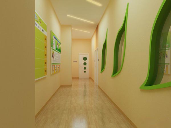 地面至1.2米處也可鑲貼瓷片,一是方便清潔,二可以增添幼兒園特色的氛圍,還可以掛上一些可供幼兒寫畫的小黑板,便于幼兒表現自我、抒發內心感受。裝飾墻面的材料顏色要淡雅、明快,要考慮環境的功能性以及采光情況。可用貼或刷的方法,裝飾出大塊的抽象圖案。幼兒園設計整體色彩既要注意統一,又要強調變化,體現幼兒園特點。