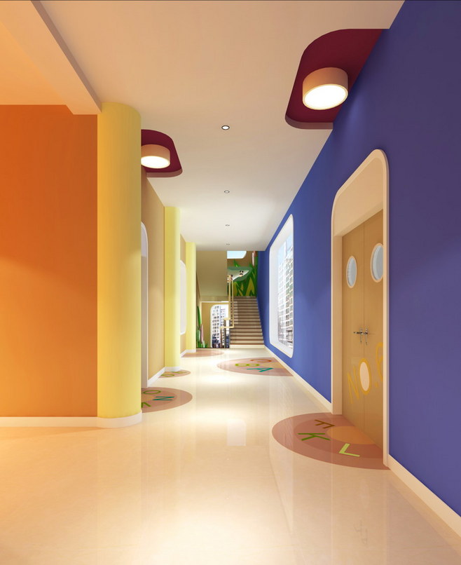 幼兒園裝修走廊要貫通一氣,盡量保證走廊的寬度在1.2米以上。邊上的圍欄最好是密封型的,高度不能低于1米。樓梯護欄在體現建筑特點上有一定的作用,因而在造型上要獨特,有幼兒園特點??纱蚱苽鹘y的平直封閉形式,有凹凸變化,可按現代的平面來構成,增加圍欄的趣味性,也可以設計成上部分通透、下部分封閉的形式,但要防止幼兒攀爬兩邊墻面。