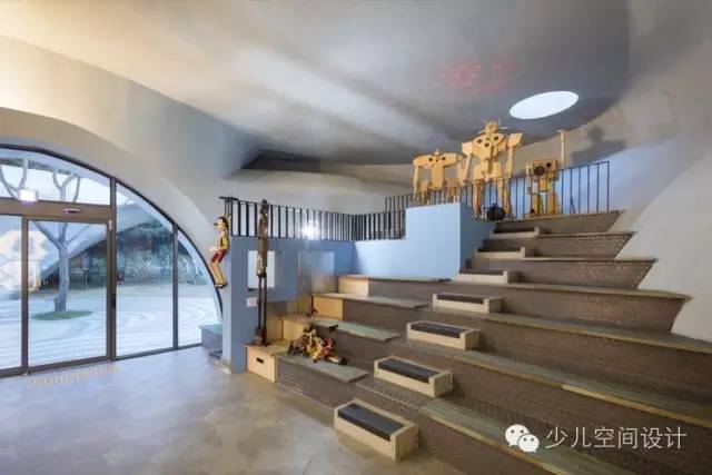 第一棟樓(波浪與鯨魚)試圖表達(dá)一種受匹諾曹故事啟發(fā)的空間,大風(fēng)暴和鯨魚等主題都進(jìn)行了表現(xiàn)。平面布局采用了曲線,讓人想到子宮內(nèi)蜷曲的胎兒。平面之后演變成了鯨魚與波浪的結(jié)合,最終融為一體。大臺(tái)階與小臺(tái)階營(yíng)造的座椅間營(yíng)造的狹長(zhǎng)扭曲空間試圖增強(qiáng)空間的游戲性與冒險(xiǎn)感。不幸的是,這里暫時(shí)關(guān)閉。被建筑圍合起來(lái)的不封頂?shù)陌伎訝羁臻g在天氣好時(shí)可以作為室內(nèi)空間的延伸。由于所有的窗戶可以折疊和推到兩側(cè),許多室內(nèi)的概念與設(shè)計(jì)都可以被盡可能地實(shí)現(xiàn),但是出于內(nèi)容與安全考慮只有中間區(qū)域可以安置這樣的內(nèi)容。
