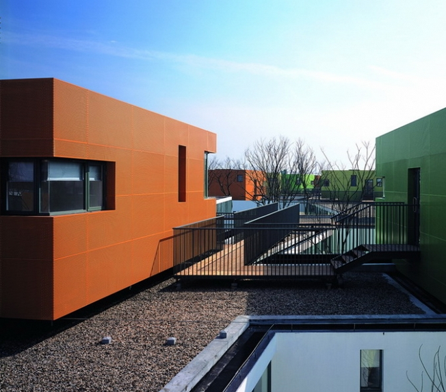 在班級單元的設計上,活動室因為需要和戶外活動院落相連而全部設于首層,臥室則被覆以鮮亮的色彩置于二層,臥室間相互獨立并在結構上令其樓面和首層的屋面相脫離,強調其漂浮感和不定性,這種不定性以及恰當尺度的相互分離導致一種看似隨意的集聚狀態,空間產生張力。每三個班級的臥室以架空的木棧道相連,這些臥室如依依不舍的村落般友好和親切。