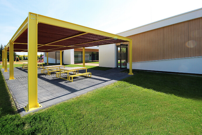 幼兒園前面的庭院設置有采沙坑和樹木,在建筑物的心臟。建筑前面有一處涼亭,涼亭里面有小桌子和凳子,都是用黃色顏料粉刷的,是供孩子們下課時享受日光浴的好去處。建筑中廳向著中庭開放,大大的窗子允許自然光最大程度地通過。儲物室和教室直接連通。儲物室的窗子可以滑開,方便了孩子們選擇最短的途徑奔向花園玩耍。有著低矮屋頂的釉面走廊是庭院的通道,走廊的玻璃窗模糊了里面和外面的邊界。(幼兒園室內設計)