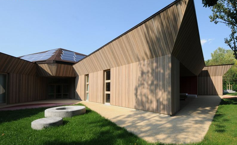 這棟建筑是由一系列連接著中心廣場的建筑群組成的,它的屋頂是不規則的幾何形狀,就像是皺紋紙一樣——這樣的形狀能更好地發揮光伏太陽能電池板的作用,這樣一來,在能源方面,這棟建筑幾乎是能夠自給自足了。建筑物的表層是由三種顏色的垂直條紋木板所組成,它們的尺寸是隨意組合的并一直延續到屋頂下的斜坡區域,形成了一種多變的紋理圖案,靜靜地被周圍的綠色所圍繞。檐廊及每片側翼的長廊仿佛是建筑群里的凹陷區域,并覆蓋了一層珊瑚紅顏色的垂直木板。這個設計好比是切片水果,里部的果肉是有色的,而外部的果皮是有紋理的。(幼兒園設計)