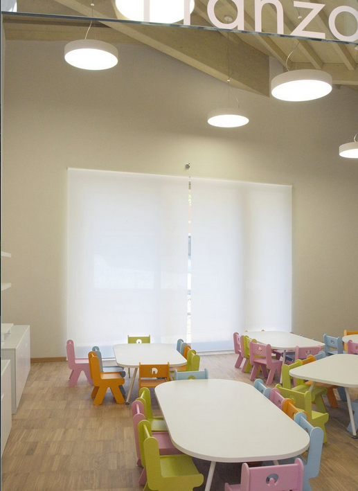 位于意大利的尼多卡利賓托兒所位于一個中型區域,通過一個中心廣場相互連通:這樣就能騰出很多空間給孩子們活動,而整個空間的比例是按照1-2歲的孩子們設計的。幾片側翼由一個單一的屋頂連接,而且都能通向中央大廳,走廊里還裝著空調。教室和“實驗室”向南分布,優先考慮自然采光和綠化帶;辦事處和服務區(洗衣房,更衣室,儲藏室)位于北面。