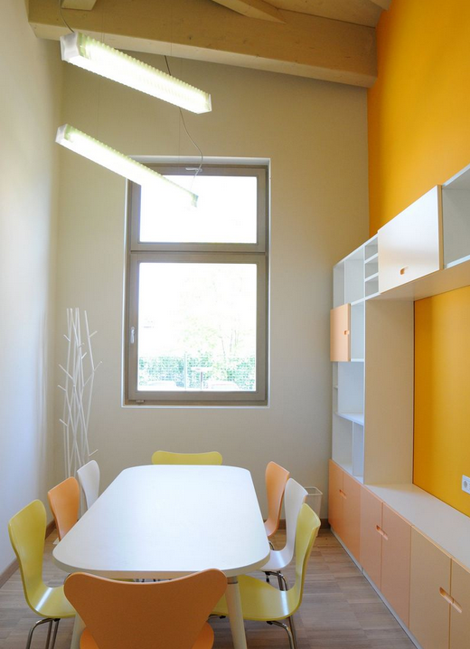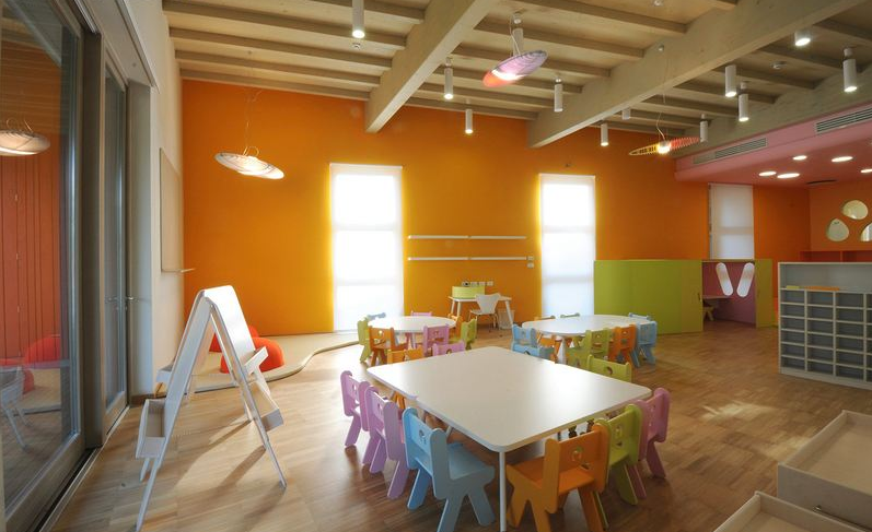 因為這些原因,孩子們應該得到良好的環境并激發他們的感知。這并不意味著這是混亂的,混雜的,過多的,有著高標準,它更是意味著復雜的,多變的,有著多語言的并能刺激不同的感官感受。幼兒園設計不止簡單的以紅黃藍去作為底色,而是匯聚了許許多多細微差別的色域,這些色調一一排列起來,形成了擺動和多變的感覺。將互補的顏色排列起來,其對別的作用有效降低了顏色的飽和度和“容積”。這樣就能更好地創造出層次感:在整個環境空間使用低飽和度的顏色,家具選擇上使用溫和的顏色,景觀設計上使用更為明亮的顏色。(幼兒園室內設計)