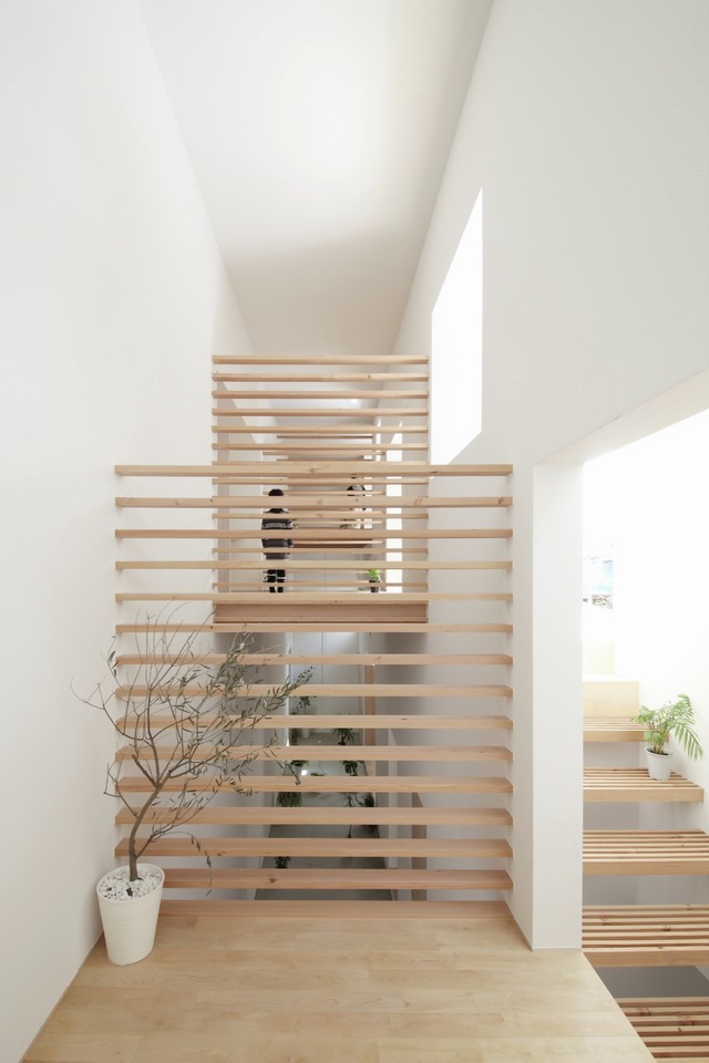 于是設計師就有了一個反L的建筑方案,而陽光收集器就是搞起來的那一部分,通過建筑頂部的天窗和方窗把陽光大口的吞噬到了室內,在室內的陽光收集器也作為樓梯,在第二層部分設計了幾間臥室,為了能讓陽光更加有效的投到首層,樓梯采取了格柵的形制,這樣使得陽光的光想盡可能的漏下去。