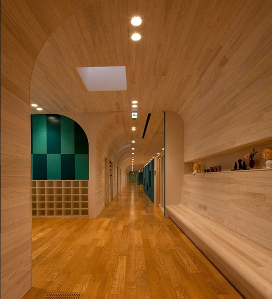 一所位于日本愛知縣張地區的旭城這是給五歲一下的一百多個孩子使用的幼兒園,在過去很多的幼兒園中孩子們的日?;顒泳拖袷浅燥埻嫠:蜕蠋蛘呤撬X都會是在分開的各個室內進行的,然后設計師的目標是想在一種連續時間狀態下去捕捉孩子的這些活動,并在這個時間容器中布局建筑以及藝術繪品,共同創造出好似一個立體圖畫書般的幼兒園。(幼兒園室內設計)