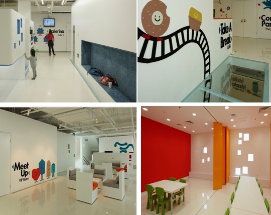 許多的空間設計都非常合理、實用而且美觀。兒童休息區設計為有長格子形狀的毛茸茸長椅,根據兒童的身高尺度來設計,小比例的空間使內部更加豐富。咖啡廳與派對室設計了透明的地板,能清楚的告訴小朋友,下邊還有東西,能激發孩子探索欲望的積極性,打破了地板的界限。家長休息室根據大人的人體比例設計了舒適的座位,家長之間更方便交流孩子學習之間的心得體會,休息室顯得格外可愛、溫暖。小食堂的設計,在內部這些墻面上采用了模擬自然陽光的技術,用以彌補采光不足。整個空間處處都體現了小盒子的造型,這些空間設計都是很溫馨、浪漫的。(幼兒園設計)