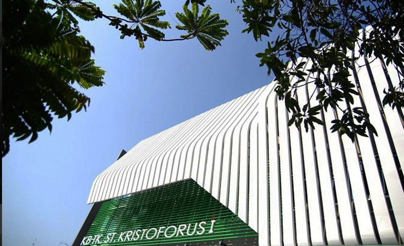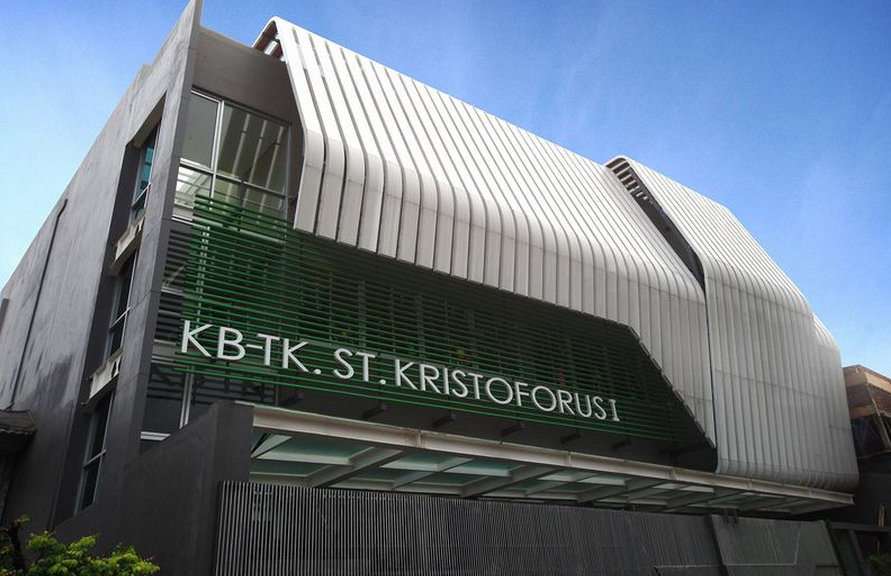 位于印度尼西亞雅加達雅加達圣·克里斯多夫魯斯幼兒園,這是一個有著三層樓的幼兒園,一樓有著辦公室、操場和游泳池,二樓是孩子們學習的教室,而三樓則是放置教學設備的區域。(幼兒園設計)