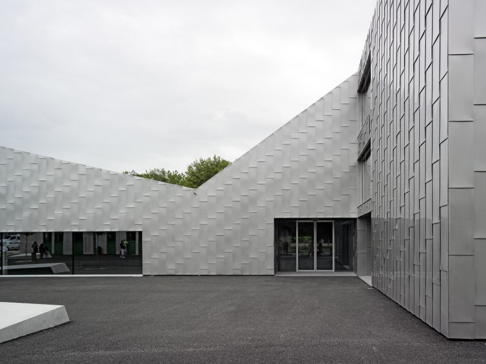 整個建筑的山墻朝向南北,與城市肌理相契合。承重墻、樓板與立面組成承重系統以鋼筋混凝土構筑而成,以求達到當地相關部門對抗震的要求。屋頂結構的兩重結構皆有木材制成,而外層則覆蓋著金屬薄片,而類似的,建筑的立面也由魚鱗般的金屬般構成。遠遠看去,建筑仿佛呼應著周圍的群山,錯落起伏。相互穿插的方形體量組合出疏密有致的空間,而高低起伏的屋頂從東向西延伸。新建的學校活動中心延續了校園現有的空間秩序,同時也與周邊的傳統建筑形式遙相呼應。