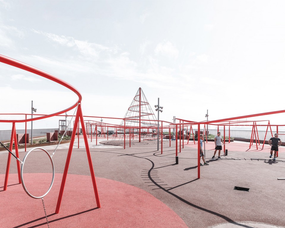 設(shè)計(jì)師沒(méi)有遮掩而是希望以暴力的結(jié)構(gòu)打破立面,樓層的外部掛著一系列的種植槽,和建筑的結(jié)構(gòu)相呼應(yīng),在給人們創(chuàng)造適宜的空間的同時(shí)也把綠色帶到了每個(gè)角落,兩條巨型樓梯穿插其中,樓梯之上采用鋼制扶手防護(hù)延綿而上,而轉(zhuǎn)到屋頂之后則是轉(zhuǎn)化為秋千、攀爬架、單杠等等面向各個(gè)年齡階層的運(yùn)動(dòng)游樂(lè)設(shè)施,創(chuàng)造出一個(gè)活力十足的公共空間。