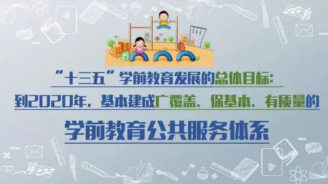 《意見》對“十三五”學前教育改革發展做出了全面部署,提出了“十三五”學前教育發展的總體目標:到2020年,基本建成廣覆蓋、保基本、有質量的學前教育公共服務體系。