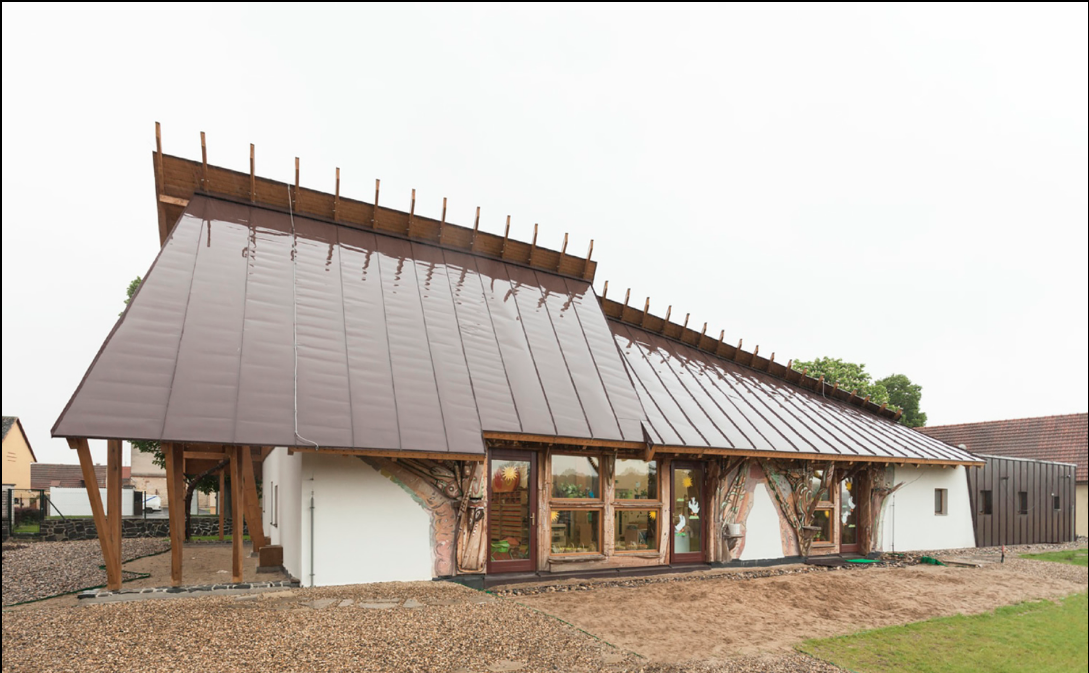 幼兒園被一個充滿了水果樹的花園所包圍,它是一層的方形建筑,屋頂是與眾不同的建筑和識別元素。北側有古典的坡頂,傾斜35度;南側緩慢朝一面墻下斜。