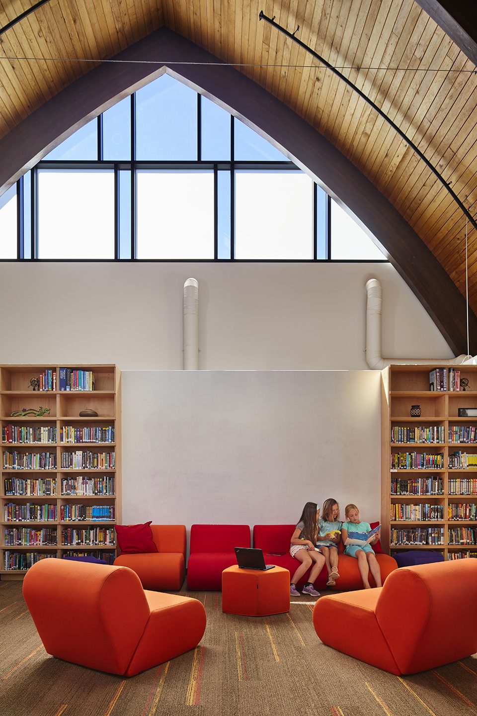 設(shè)計的挑戰(zhàn)在于如何使既有建筑與新的入口大廳形成連接,同時傳達出一種統(tǒng)一感。新的建筑提供了大量具有鼓勵性的學(xué)習(xí)環(huán)境。嵌入教室墻壁的創(chuàng)意空間為自主交流和非正式的小組教學(xué)提供了靈活的場所。其他空間也致力于促進互動創(chuàng)新和引發(fā)好奇心。新的入口在建筑中心構(gòu)成了一個透明的集會和展示空間,使家長、教學(xué)人員和學(xué)生能夠在這里聚集和溝通。5.5萬平方英尺的建筑空間(既有面積3.5萬平方英尺/擴建面積2萬平方英尺)最終將學(xué)校的過去與未來連接在一起。